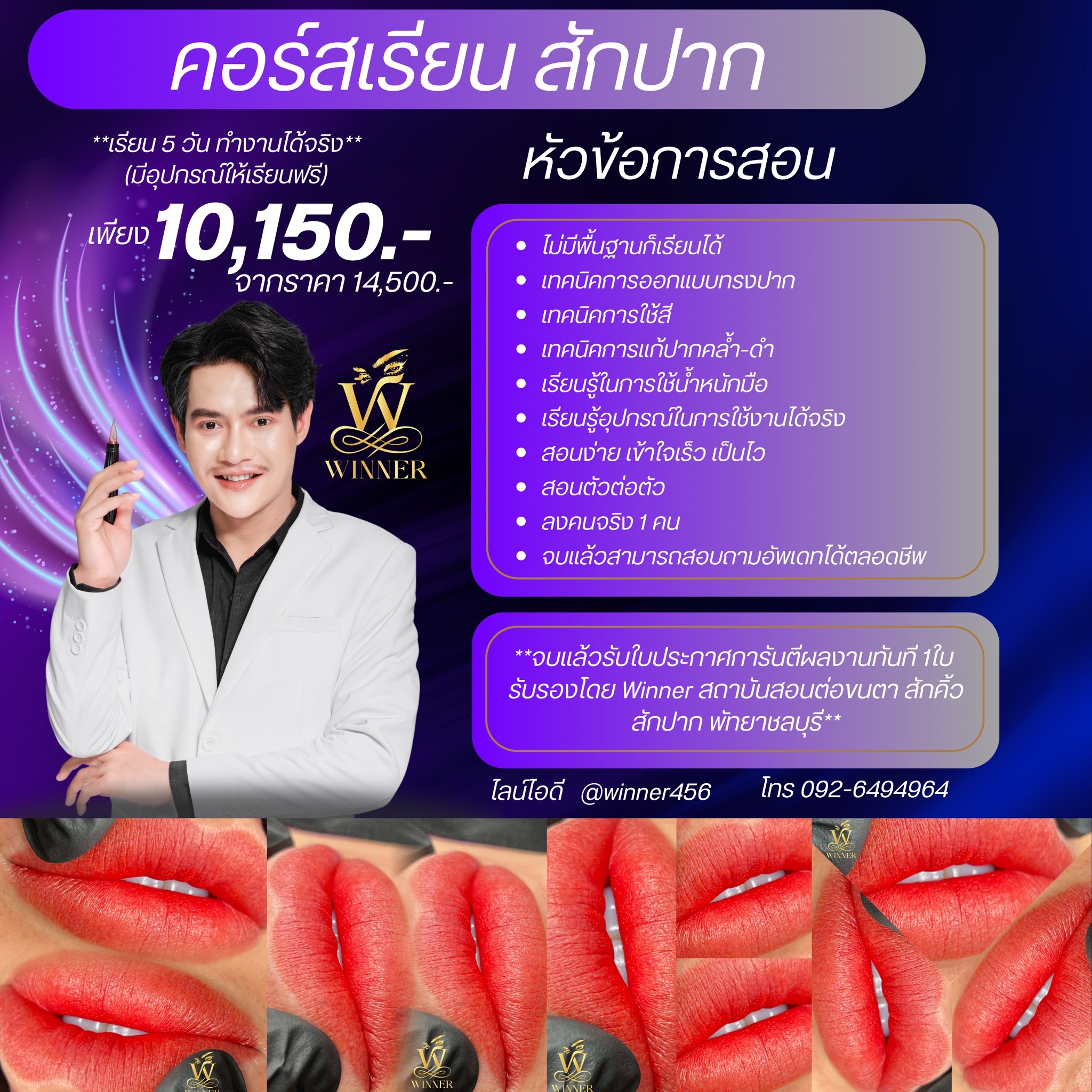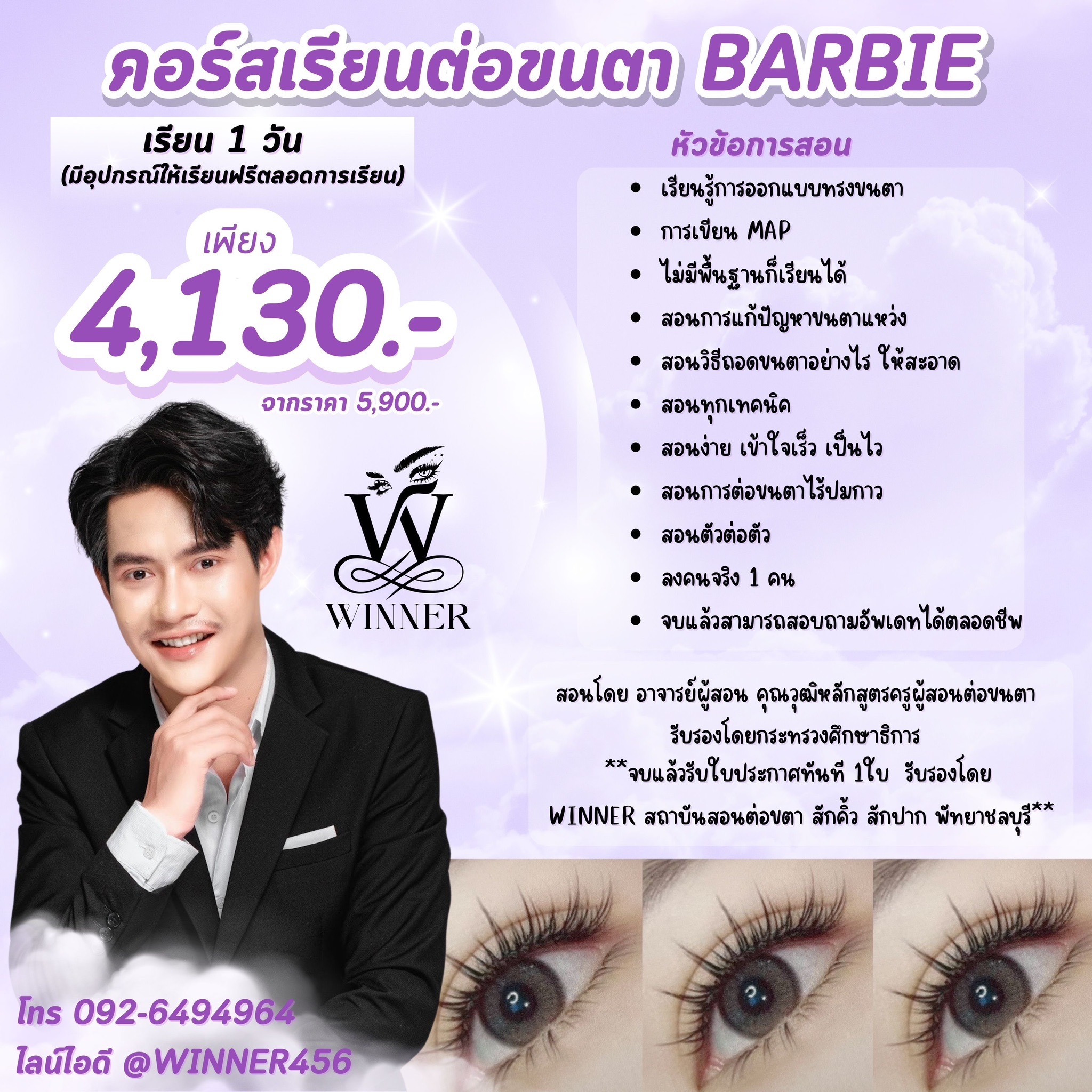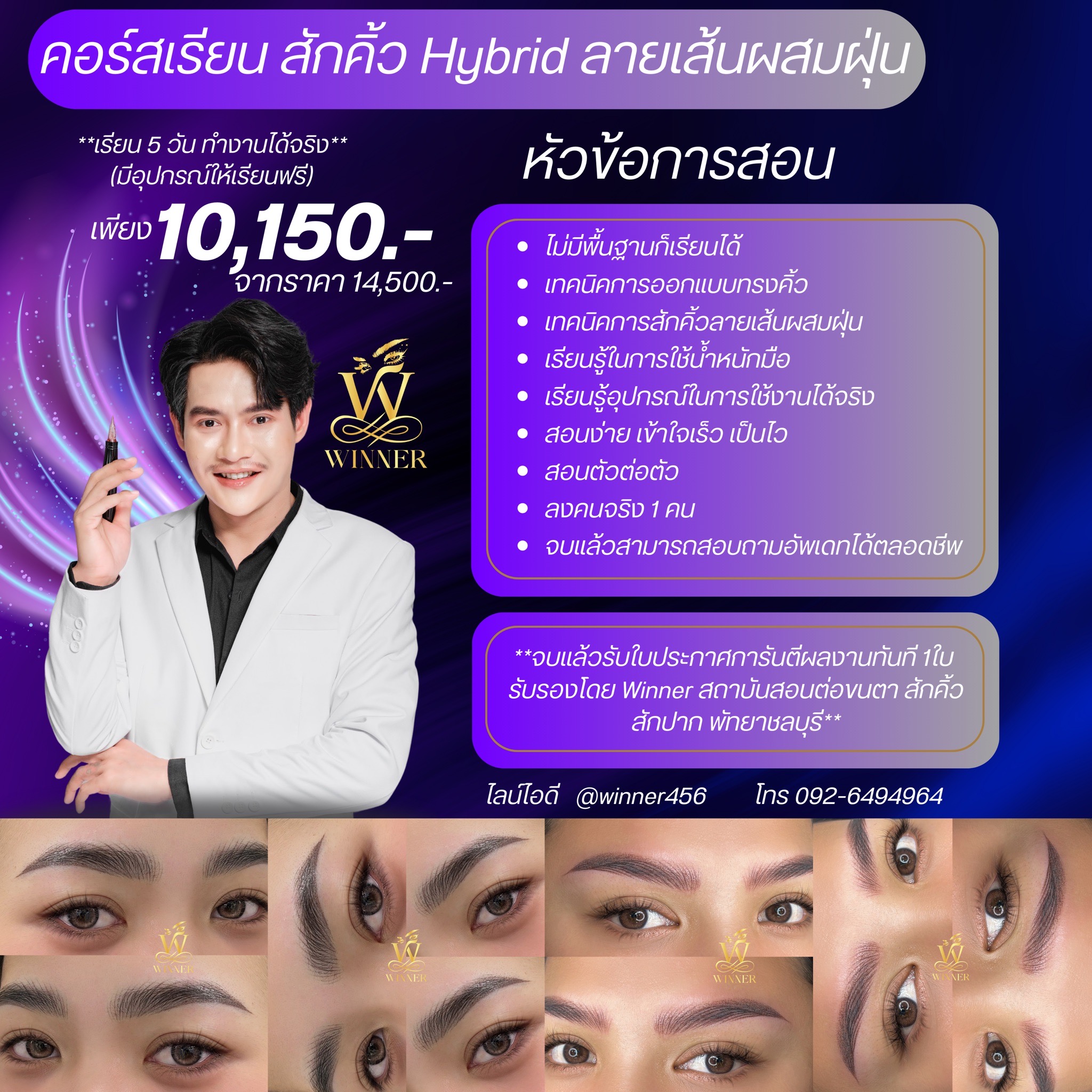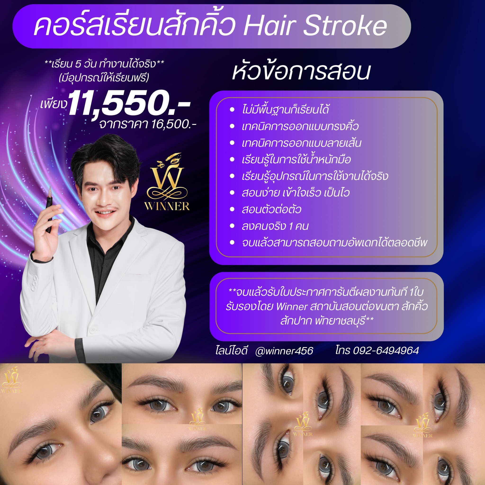 สถาบัน WINNER Academy มุ่งมั่นที่จะพัฒนาศักยภาพของผู้เรียบให้ มีความเชี่ยวชาญในด้านการต่อขนตา สักคิ้ว และสักปาก ด้วยเทคนิคที่ทันสมัยและปลอดภัย